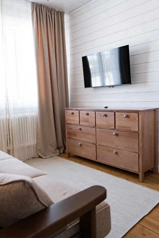 В одной комнате двуспальная кровать с ортопедическим матрасом, в другой комнате раскладной диван. Отдельно выделена кухонная и столовая зона, санузел с душевой и всеми необходимыми средствами.
